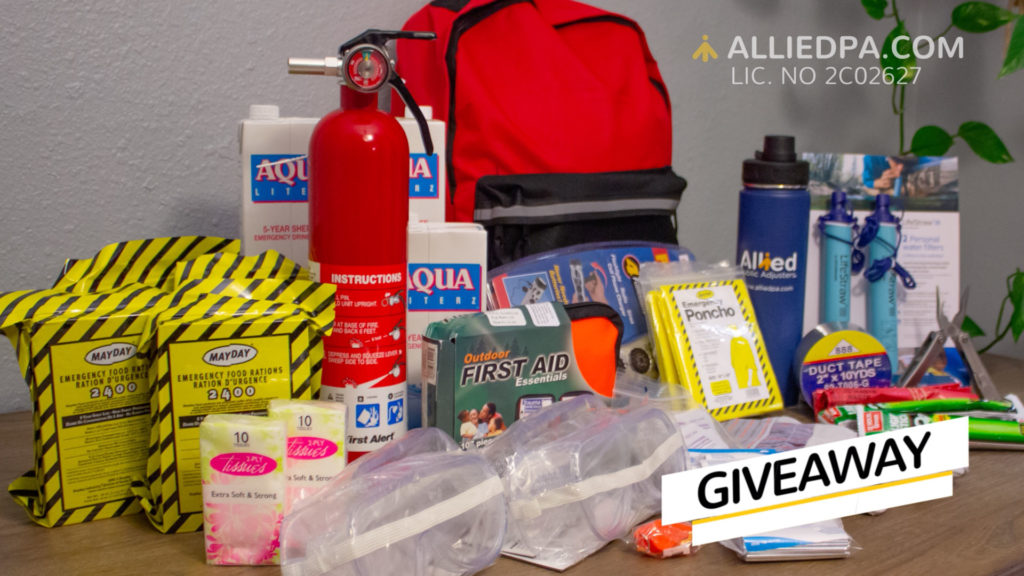 Allied Public Adjusters is here to ensure your safety by giving away a family emergency preparedness kit. The kit includes valuable resources like a fire extinguisher, flashlight, first aid kit, reusable water bottle, emergency whistle, LifeStaw®, heavy duty gloves, enough food and water for 72 hours, and two backpacks to store the items in.